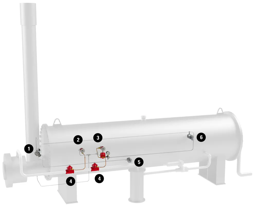 As the pressure of process fluid is cut from high to lower pressure, the Joule-Thomson effect (also referred to as the “JT effect”) can cause an extreme drop in the fluid’s temperature. This can quickly result in hydrates freezing in the line, blocking flow and shutting in the pipeline until the frozen hydrates are thawed or removed. A line heater is used in order to prevent this freezing. A line heater is a horizontal vessel used to heat up the well stream. The heater uses supply gas to run the burner fire and heat the fire tube. The fire tube runs along the bottom of the vessel and heats the surrounding liquid, often referred to as a “water bath.” Meanwhile, the process fluid runs through a series of coils above the fire tube. The coils are also submerged, allowing the process fluid inside to absorb heat from the vessels water bath. This raises the temperature of the well stream to prevent freezing.