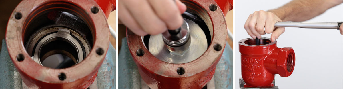 - Using the Kimray seat removal tool and a 1” socket and extension, remove the seat and gasket. If this is a new valve, these can be saved for another use or application. If it’s been used, these can be discarded.