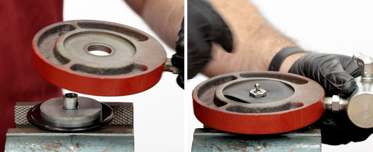 - Place the diaphragm plate into the vise, with the female threaded end facing up.
