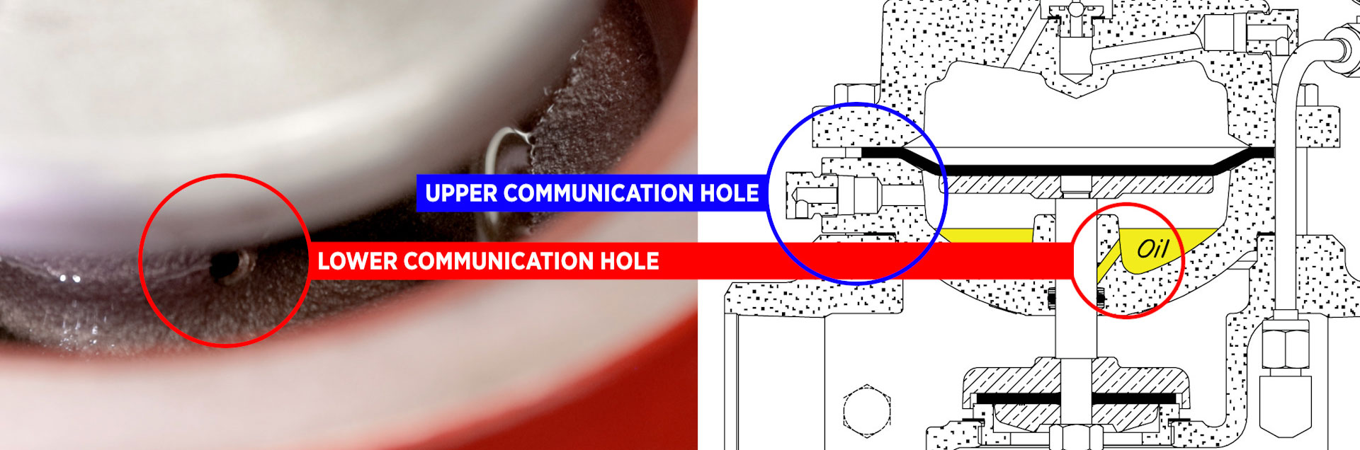 - Add any kind of light gravity all-purpose oil to the housing until the oil is above the lower communication hole and below the upper communication hole.