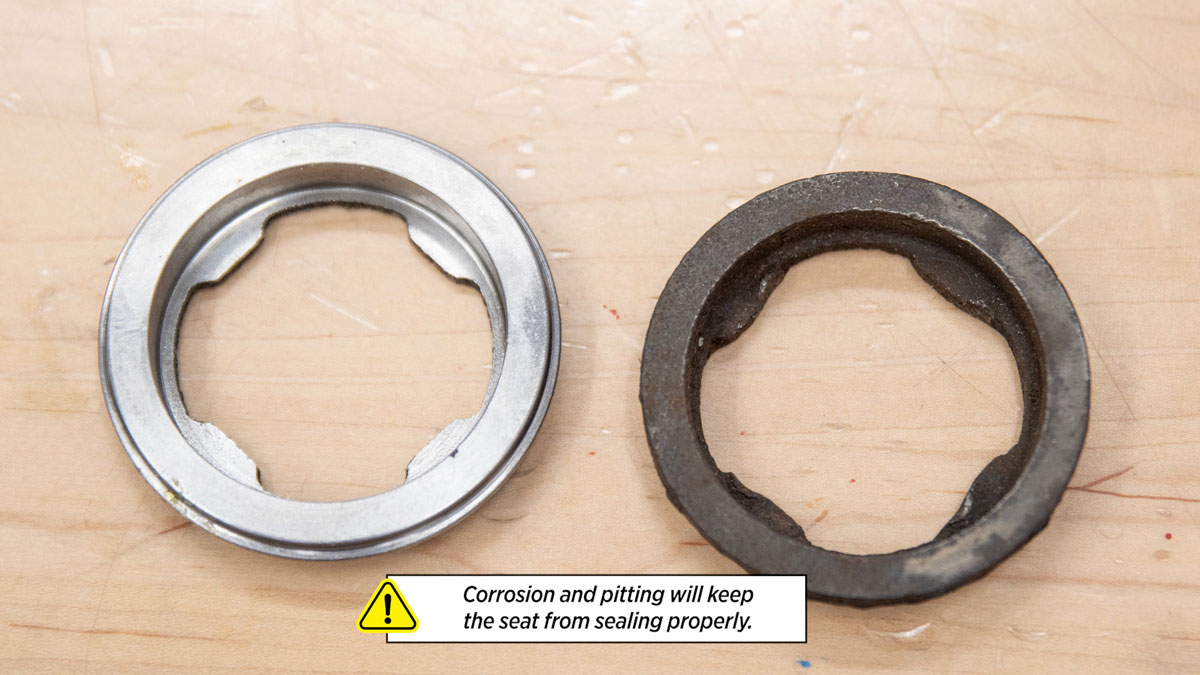- Inspect the removable seat for damage. Corrosion and pitting will keep the elastomer seat from sealing properly. Replace it if needed.