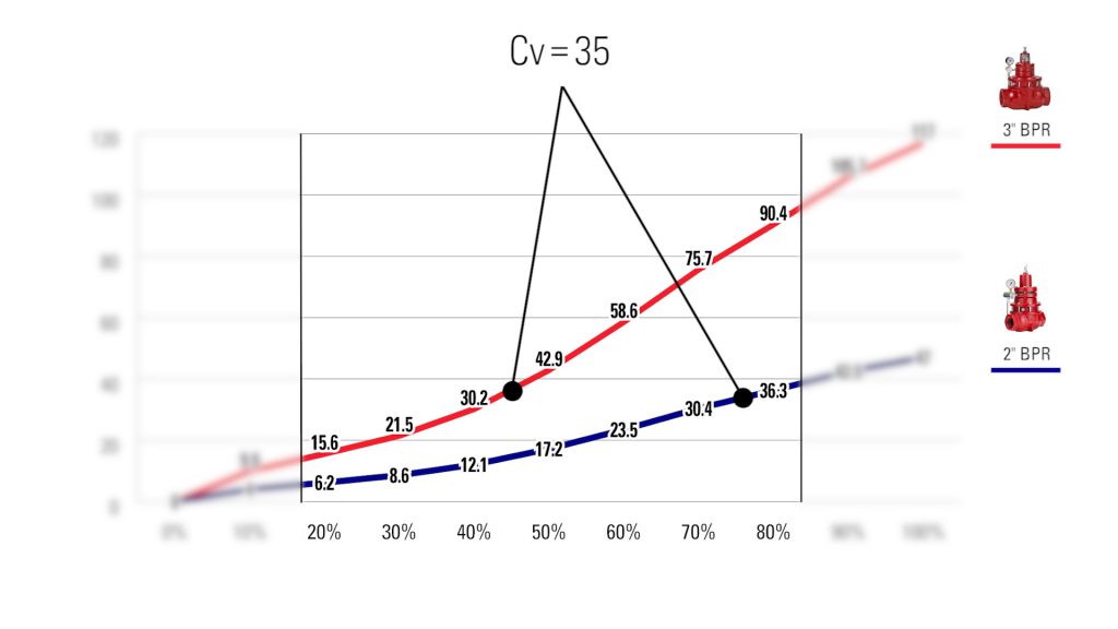 Si calcula un valor Cv de 35, este se encuentra dentro del rango de ambas válvulas. En este caso, recomendaríamos la válvula de tres pulgadas porque caen más cerca del centro de la curva de flujo.