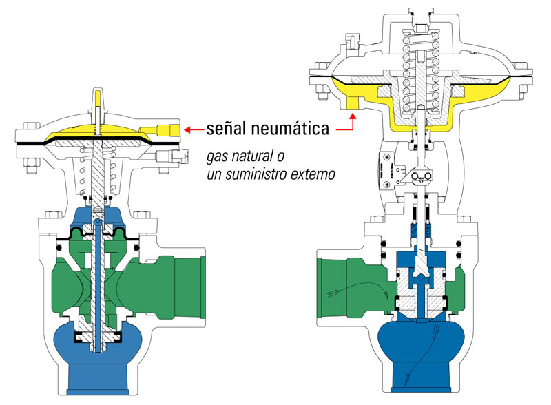 Las válvulas de descarga operadas neumáticamente utilizan una señal neumática para funcionar, ya sea gas natural o un suministro externo como nitrógeno líquido o aire comprimido, o algunas pueden combinarse con un actuador eléctrico en su lugar.