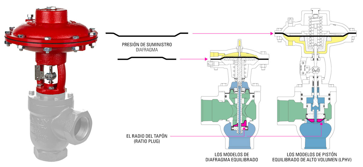 En comparación con el modelo equilibrado con diafragma neumático, el actuador LPHV permite un funcionamiento más suave y un control más preciso. Las características de tapón y flujo de relación de la válvula también ayudan con la acción de estrangulamiento y permiten que pase un mayor volumen de fluído a través del ajuste.